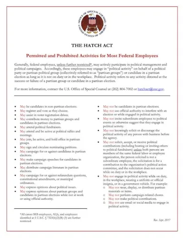 The Hatch Act is the law that sets limits on what federal employees can and cannot do in connection with elections and political activities. The Office of Special Counsel (OSC) enforces this law and has created the one-page poster below to help employees understand what actions are permitted or prohibited during an election.